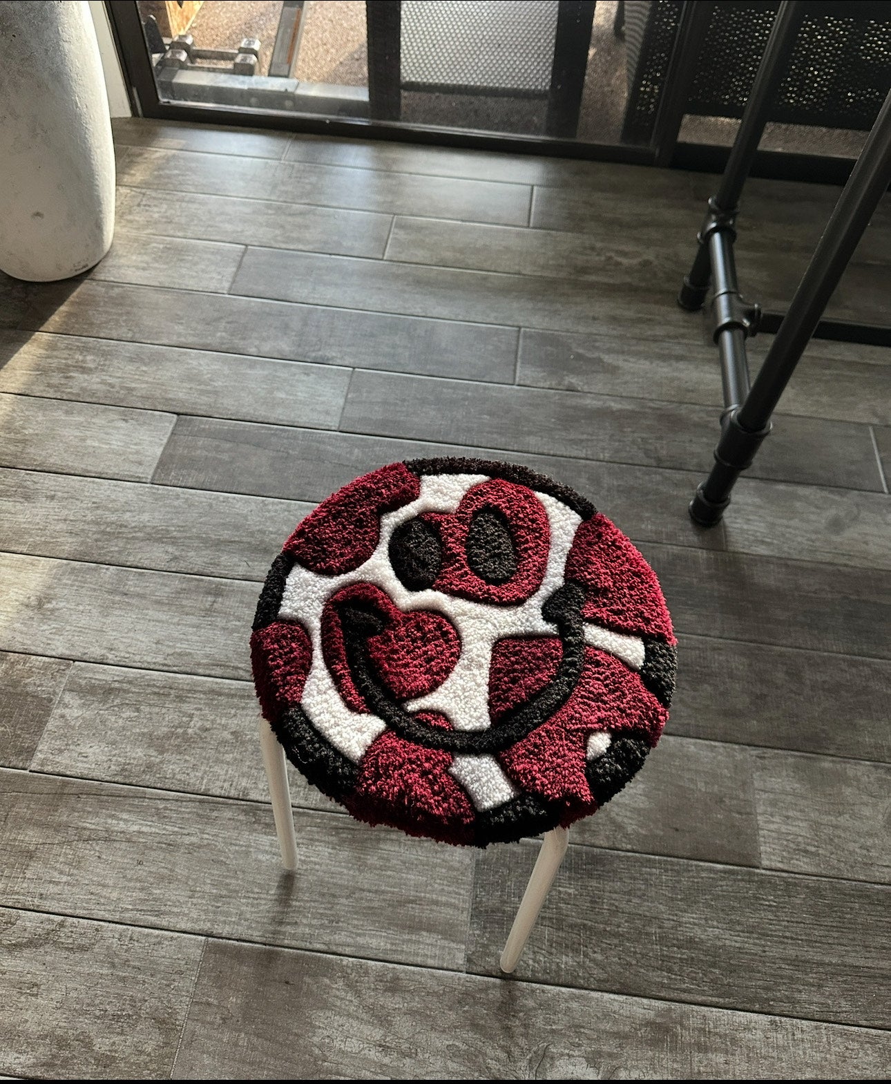 This handcrafted smiley stool features a soft tufted rug top with a bold graphic design that adds personality and texture to any space. Built with a sturdy base and plush surface, it functions as both a comfortable seat and a playful statement piece for modern interiors.